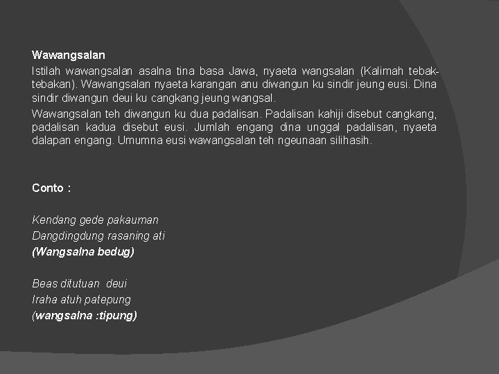 Contoh Sisindiran Wawangsalan - Drama Sisindiran Belajar - Contoh (1) merupakan contoh data sisindiran.. Rarakitan di dalam sisindiran adalah kawih 'lagu' yang sampiran dan isinya memiliki kesamaan pada awal lariknya. Contoh sisindiran paparikan, rarakitan dan wawangsalan · sisindiran adalah puisi sunda terikat sunda tradisional. Baca juga sisindiran sunda | conto wawangsalan, rarakitan dan paparikan lengkap lainnya nah, itu saja yang bisa saya sampaikan tentang . Contoh (1) merupakan contoh data sisindiran. Sebelum membuat contoh wawangsalan atau melengkapi isi teks .